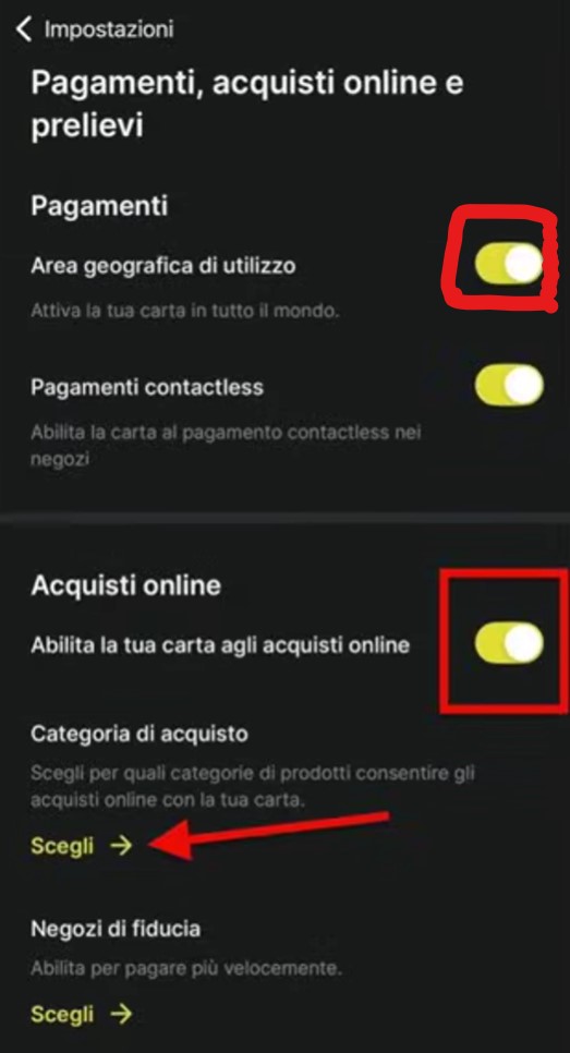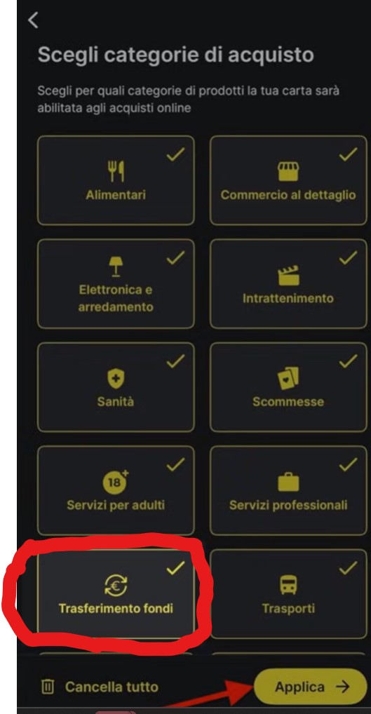 Quindi andare alla sezione “Categoria di acquisto” e attivare “Trasferimento fondi”